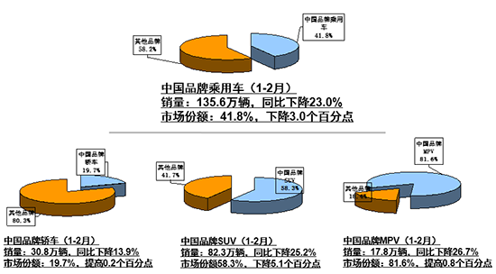 1-2月,自主品牌乘用车共销售135.64万辆,同比下降22.97%,占乘用车销售总量的41.82%,占有率比上年同期下降2.97个百分点。分车型来看,自主品牌轿车1-2月共销售30.8万辆,同比下降13.9%,市场份额为19.7%,较上一年提高0.2个百分点;自主品牌SUV销售82.3万辆,同比下降25.2%,市场份额为58.3%,较上一年下降5.1个百分点;自主品牌MPV销量为17.8万辆,同比下降26.7%,占市场份额81.6%,提高0.8个百分点。
