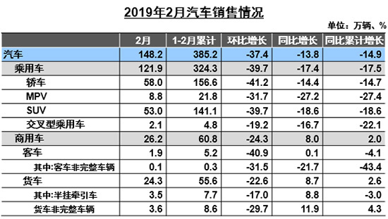 中汽协秘书长助理陈士华表示,受市场低迷和春节假期的影响,2月汽车产销量总体水平较低。一方面行业企业谨慎应对经济运行压力,另一方面主动降低生产节奏减轻终端压力。此外,由于今年春节在2月月初,节后企业恢复生产节奏较慢,也使汽车生产和销售受到了影响。