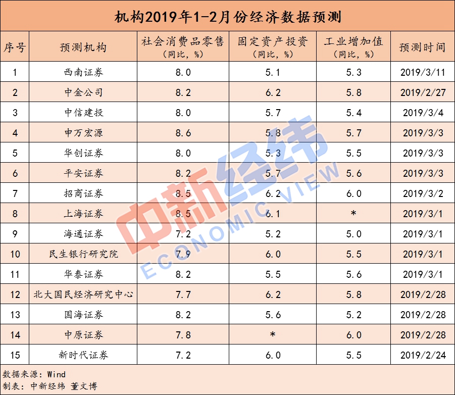 投资方面,中新经纬客户端梳理发现,截至3月13日,14家机构对2019年1-2月固定资产投资(不含农户)增速预测平均值为5.8%。