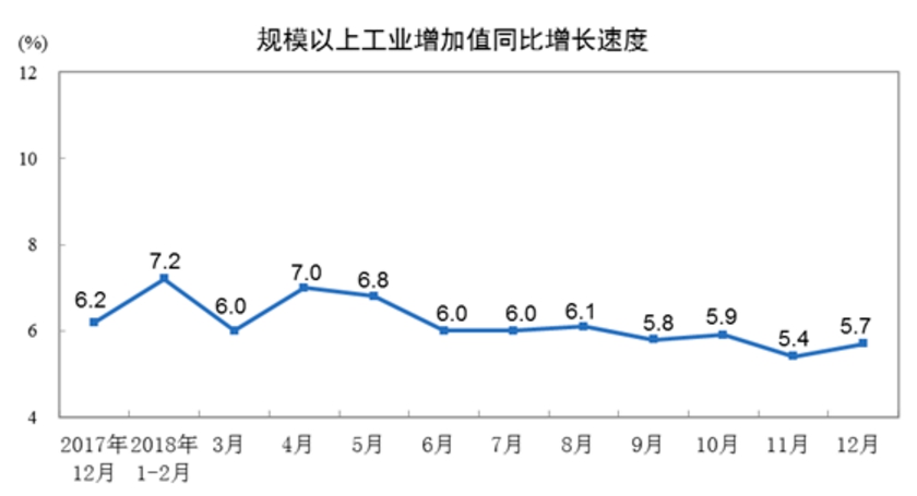 工业方面,从国家统计局公布的历史数据来看,截至2018年12月,规模以上工业增加值同比增速已经连续4个月处于“5时代”。