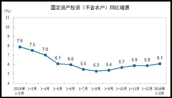 2019年1-2月份,全国固定资产投资(不含农户)44849亿元,同比增长6.1%,增速比2018年全年提高0.2个百分点。从环比速度看,2月份固定资产投资(不含农户)增长0.43%。其中,民间固定资产投资26963亿元,同比增长7.5%。