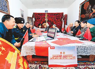 在新疆维吾尔自治区木垒哈萨克自治县,边境派出所民警向边境牧区牧民群众宣传讲解两会精神。周 游摄(人民视觉)