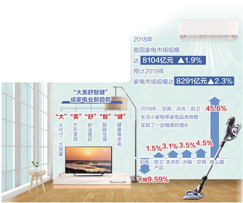 全国家用电器工业信息中心预测,2019年家电市场规模有望达8291亿元,同比增长2.3%。消费升级、产业升级的大趋势不会变,品质化、高效化、细分化将是家电产品发展的主旋律。