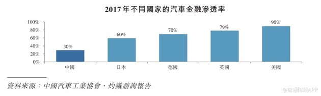 当下,中国汽车金融市场的不发达,还可从汽车金融的渗透率中看出。汽车金融的渗透率是指通过贷款、融资等金融方式购买的车辆数量与汽车销量之比。中国的汽车金融渗透率仅30%,与成熟的市场平均超60%的渗透率相比,仍有很大的提升空间。