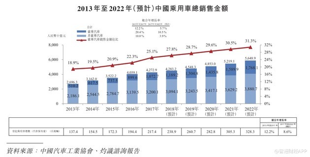 据智通财经APP了解,2013年-2017年,中国豪华汽车销售金额由人民币5,102亿元大幅增加至人民币10,727亿元,年复合年增长率为达20.4%,增速远超非豪华汽车市场。同时,豪华汽车在乘用车市场中的份额亦由18.9%增至25.1%。据第三方咨询公司灼识资讯调查,豪华汽车的销售金额仍将进一步提高,到2022年将达到人民币17,681亿元,复合年增长率为10.5%,约占2022年整体乘用车市场的31.3%。