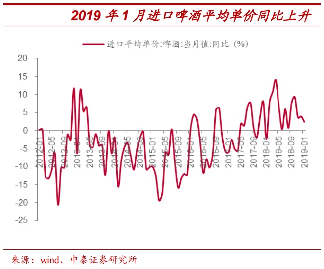 同时,在行业新增产能减少及现有产能去化的背景下,啤酒行业开启消费升级。2019年1月36个大中城市瓶装啤酒的均价同比上升3%,罐装均价同比上升0.5%。中泰证券还发现,进口啤酒的平均单价在1月份同比增长了2.4%,进口均价从2017年下半年开始保持上升趋势,也反映了啤酒行业的结构升级。