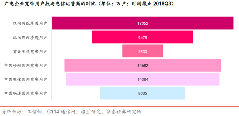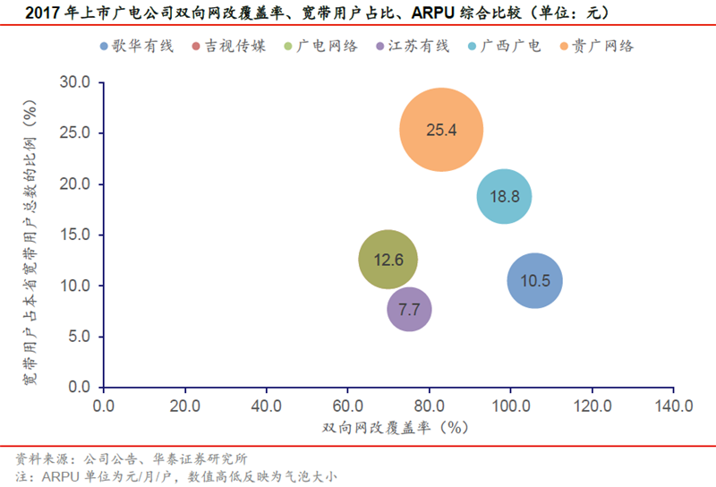 华泰证券通过地方宽带用户的占比来观察广电运营商在本地网络市场的竞争情况,其中贵广网络、广西广电的占比在各省广电的横向比较中位于较高水平,在与地方三大运营商的竞争中具备一定的实力。总体上认为双向网覆盖程度高、地方竞争格局优的公司更具发展弹性。