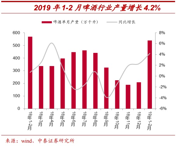 2019年1-2月啤酒行业累计产量为539万千升,同比增长4.2%。自2018年9月以来,啤酒行业单月的产量增速环比持续加快。同时,2019年1-2月餐饮业收入同比增长9.7%,环比2018年12月的9%加速(2018年全年增速为9.5%);限额以上(限上)餐饮收入增长8.1%,环比2018年12月的5.5%加速明显(2018年全年增速为6.4%)。中泰证券认为,餐饮业的增速回升推动了啤酒行业量的增长,而限上餐饮更强的复苏趋势有利于啤酒行业的消费升级。