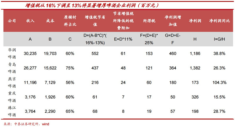此外,2019年4月1日起制造业等行业增值税税率从16%降至13%,减税对于利润率偏低的啤酒行业贡献的利润弹性十分显著。中泰证券指出,以2017年财报数据为准,当增值税下调3个百分点时,燕京啤酒、华润啤酒、珠江啤酒、青岛啤酒、重庆啤酒的净利润理论上将增长104.3%、38.8%、28.7%、26.3%、15.5%。