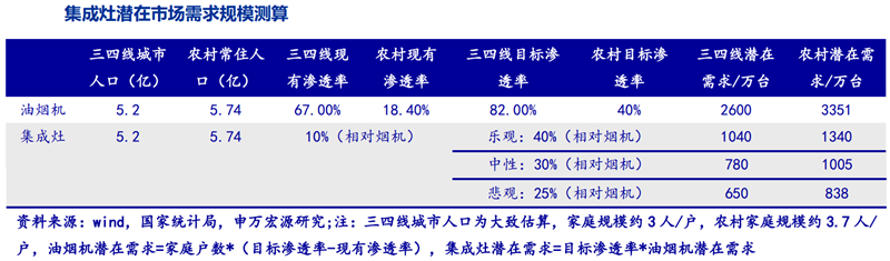 近年来,集成灶产品凭借出色的吸油烟能力、低噪音、节省厨房空间和性价比优势,2015年后度过初级导入阶段进入爆发增长阶段。根据中怡康统计,2015-2018年集成灶销量复合增长率36%,2018年销量达175万台,相对传统油烟机的渗透率从3%一路提高到近10%;零售额达129亿元,成为厨电行业七大品类(烟灶消微蒸烤洗)中第三个破百亿的单品。选取三四线及农村地区人口和烟机保有量测算集成灶新增需求的中期市场规模天花板,即使未来集成灶相对烟机渗透率只提高至25%,潜在市场容量达1500万台,剔除现有存量750万台后,新增需求仍是集成灶年销量的4倍以上,中期成长性无需担忧。