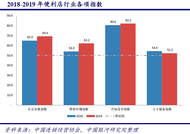 2018年便利店行业的整体指数情况表现良好,企业发展、营商环境、市场竞争和人才储备指数均高于荣枯线,显示出行业稳健的现状;对比2019年的景气度预测情况,企业发展、营商环境、市场竞争指数都出现不同幅度的提升,行业总体保持乐观的发展态度。