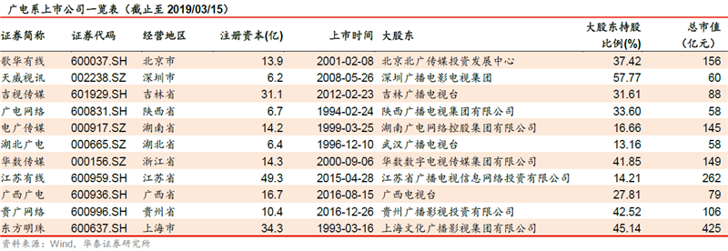 华泰证券认为,全国一张网的推进和5G背景下向智慧广电转型,广电业迎来新的发展契机,建议从以下两条逻辑寻找行业投资机会:1、拓展智慧广电业务时,双向网覆盖程度越高越具备业务支撑能力,竞争格局越优则越具备业务开展能力,建议关注贵广网络(600996.SH)、广西广电(600936.SH)、天威视讯(002238.SZ)、华数传媒(000156.SZ)、歌华有线(600037.SH);2、估值角度:从PB看,湖北广电(000665.SZ)、江苏有线(600959.SH)、歌华有线(600037.SH)、东方明珠(600637.SH)估值较低;从用户规模和ARPU值角度看,关注广电网络(600831.SH)。