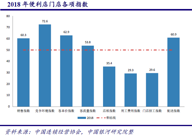 从企业的门店指数情况来看,2018年门店销售、竞争环境、客单价、客流量以及配送指数均高于荣枯线,主要是店租、用工费用和门店招工三个方面为企业的门店经营带来压力,这与行业整体的发展预期情况相符。数据显示在便利店行业竞争激烈的环境中,仍有61.1%的门店实现了销售额的增长,其中配送指数为本期景气报告中新增的指标,反映出便利店不再仅限于通过改善商品结构等传统方式提升客流量与客单价,而是考虑为消费者提供更为全面的商品服务。