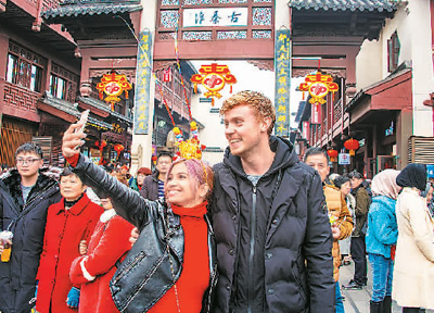 外国游客在南京夫子庙游玩时自拍留影。谷昌旺摄