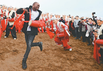 在陕西延安安塞区南沟进行的一场腰鼓演出结束后,一名外国游客与当地腰鼓手共同打起了腰鼓。新华社记者 刘 潇摄