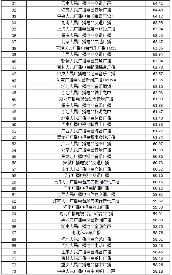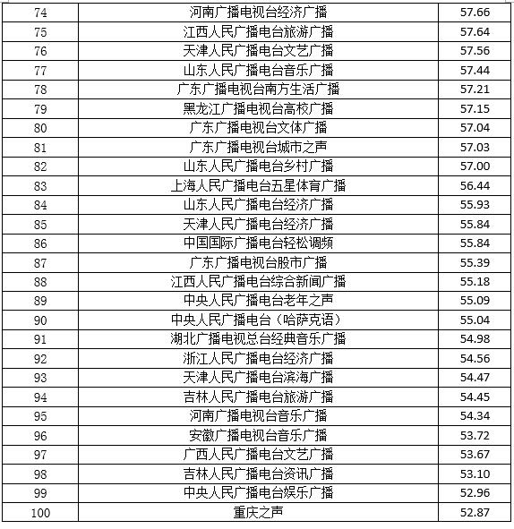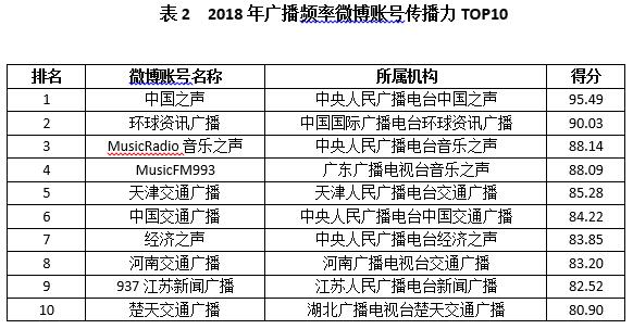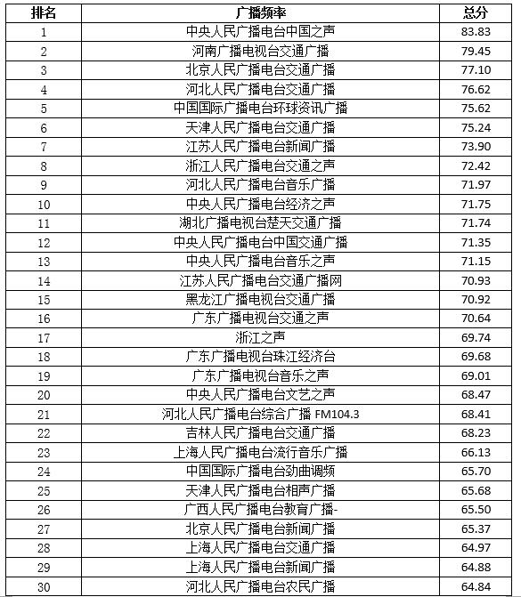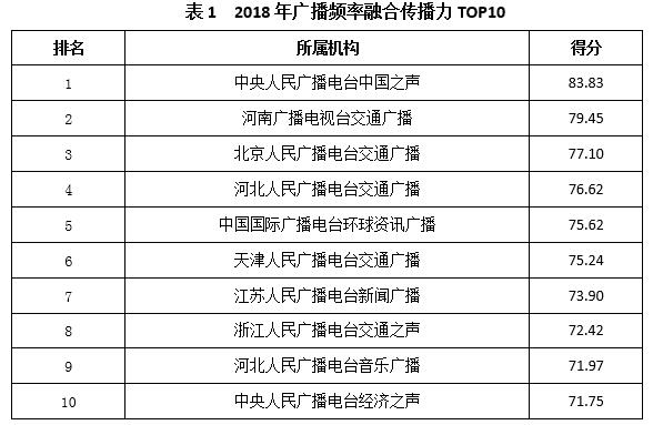 综合广播收听率、网站、微博、微信、聚合新闻平台、音频客户端、广播自建客户端等传播情况,融合传播力排名前10位的广播频率见下表: