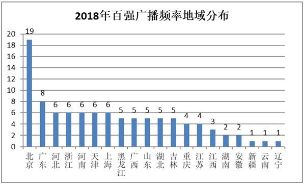 从百强广播频率的地域分布来看,北京有19个广播频率进入百强,数量最多,其中包含14个中央级广播频率和5个省级广播频率。广东有8个广播频率进入百强,仅次于北京。河北、浙江、河南、天津、上海均有6家入榜。黑龙江、广西、山东、湖北、吉林均有5家入榜。中部地区和东北部地区相较于2017年有崛起的趋势,进入百强数量增多。华北、华东与华南沿海地区优势仍然明显(见图1)。