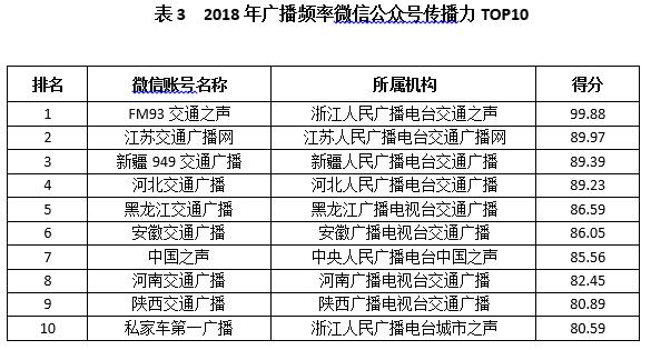 综合考察发文量、阅读量、点赞量等各项指标,传播力排名前十位的广播频率微信公众号见表3。除中央人民广播电台中国之声之外,其他进入十强的广播微信公众号均为省级交通广播频率微信号。