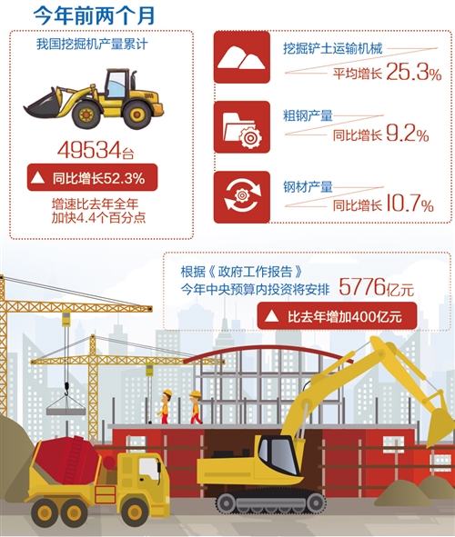 国家统计局近日发布的数据显示,今年前两个月,我国挖掘机产量累计49534台,同比增长52.3%,增速比去年全年加快4.4个百分点。