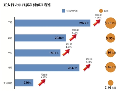 五大国有银行2018年共赚10088.3亿元,比2017年增长4.66%,日均赚27.6亿。其中,工行以2977亿元的净利润位居首位。