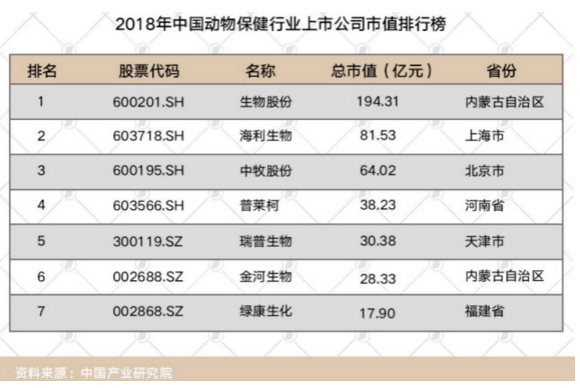值得关注的是,中国动保上市公司的规模整体不大,且差距明显。2018年中国动物保健行业上市公司总市值排行榜主要统计了7家沪深上市企业的市值排名,市值超过百亿元的仅1家,是来自内蒙古自治区的生物股份(600201.SH),市值达194.31亿元。海利生物(603718.SH)市值居第二为81.53亿元,与市值排名第一的企业相差112.78亿元。中牧股份(600195.SH)市值居第三,为64.02亿元。