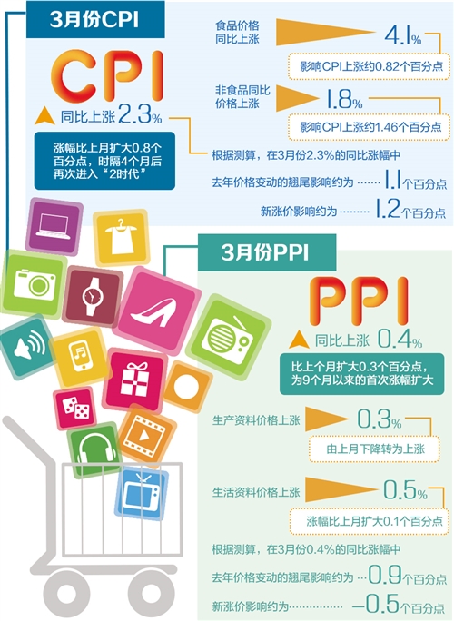 4月11日,国家统计局发布了2019年3月份全国居民消费价格指数(CPI)和工业生产者出厂价格指数(PPI)数据。数据显示,3月份CPI同比上涨2.3%,涨幅比上月扩大0.8个百分点,时隔4个月后再次进入“2时代”;PPI同比上涨0.4%,比上个月扩大0.3个百分点,为9个月以来首次涨幅扩大。