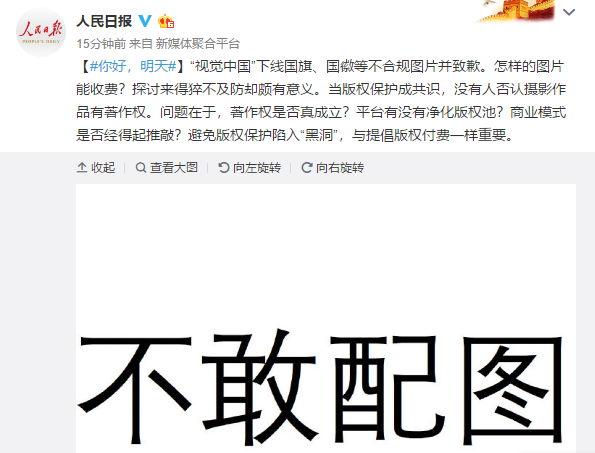 人民日报官微11日指出,“视觉中国”下线国旗、国徽等不合规图片并致歉。怎样的图片能收费?探讨来得猝不及防却颇有意义。当版权保护成共识,没有人否认摄影作品有著作权。问题在于,著作权是否真成立?平台有没有净化版权池?商业模式是否经得起推敲?避免版权保护陷入“黑洞”,与提倡版权付费一样重要。(人民日报)