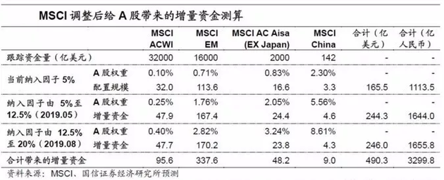 国信证券首席策略分析师燕翔预计,若MSCI将A股的纳入因子从5%提升至20%,对A股市场带来的增量资金约为490.3亿美元(约3299.8亿元人民币),其中,2019年5月和2019年8月带来的增量资金分别为244.3亿美元(约1644.0亿元人民币)和246.0亿美元(约1655.8亿元人民币)。