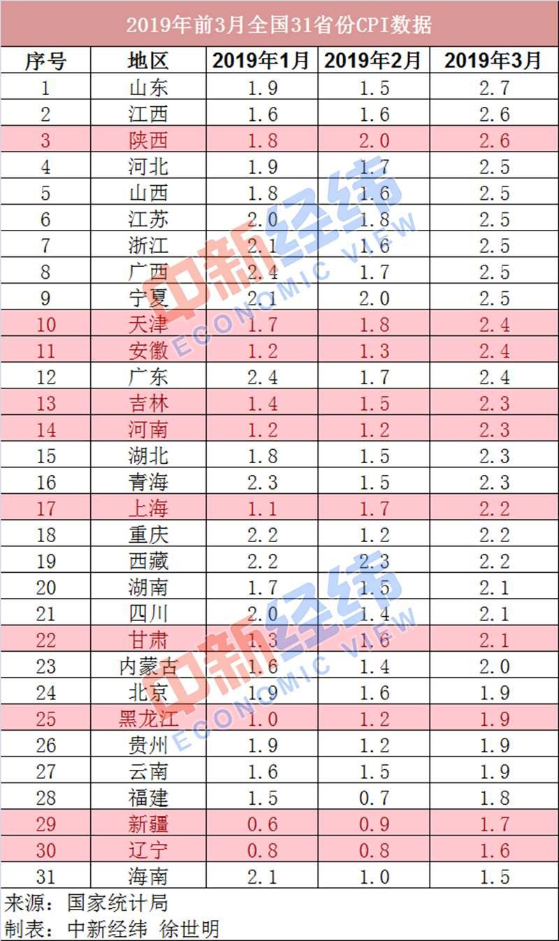 中新经纬客户端4月19日电 (徐世明)近日,国家统计局公布了3月份全国31个省(区、市)居民消费价格指数(CPI),其中,山东、江西、陕西等12个省份涨幅超全国。