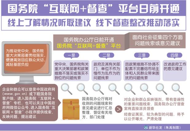 据国务院办公厅有关负责人介绍,今年《政府工作报告》明确部署实施“互联网+督查”,既是顺应新时代发展要求、改进优化督查方式、减轻基层负担的积极探索,也是深化“开门搞督查”理念、主动接受人民监督、建设服务型政府的重要举措。依托国务院“互联网+督查”平台,将有效整合督查力量和信息资源,逐步实现督查线索网上实时收集、云端智能分析、线上分类处理、线下督查整改,形成统筹、规范、便捷、高效的常态化督查新格局。这既有利于更加全面精准地解决企业和群众关心的难点堵点问题,促进党和政府的利企惠民政策落地见效,又有助于压减集中督查次数,提高督查的针对性和实效性,实现督查增效和基层减负并举。