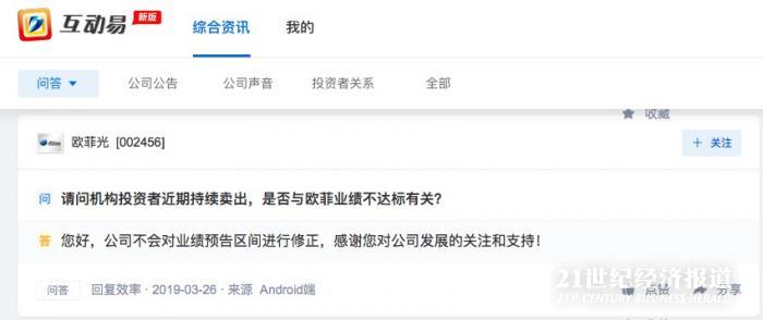 从正100%+到负100%+的增速差异,变脸坐实。要知道就在3月26日,有投资者在深交所互动易平台询问公司“请问机构投资者近期持续卖出,是否与欧菲业绩不达标有关?”时,官方回复是“公司不会对业绩预告区间进行修正”。