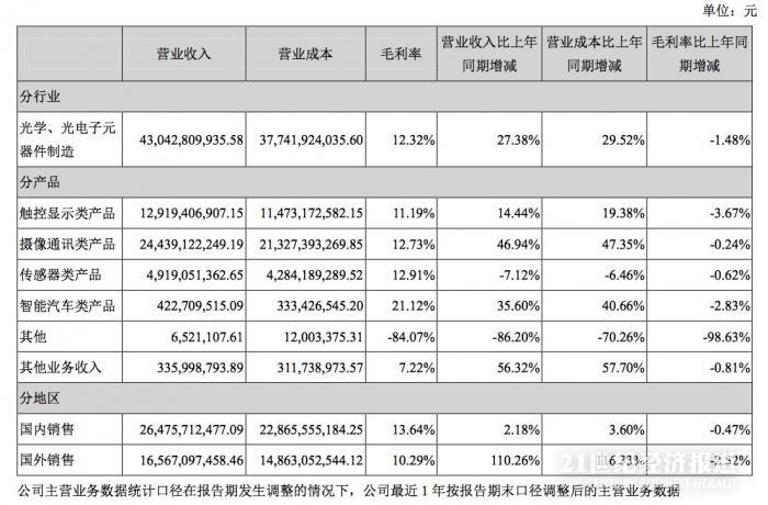 年报显示,光学产品是公司的收入主力,且增速强劲;而触控类产品增速偏慢;智能汽车产品增速快,但目前贡献偏低;生物识别产品是唯一收入下降的业务。