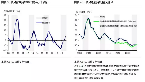 按信贷脉冲和整体信贷增速反弹来衡量,本轮刺激规模要小于前几轮(参见《本轮政策刺激与过去有何不同?》)。我们预计今年年底整体信贷增速会从去年年底的9.5%反弹至11.5%左右(预计官方社会融资规模余额增速从9.8%反弹至11.8%左右)。这意味着我们估算的信贷脉冲可能会在今年年中转正,并在年底达到4-5%(占GDP比重),反弹幅度较前几轮货币信贷宽松更为温和(图3、图4)。