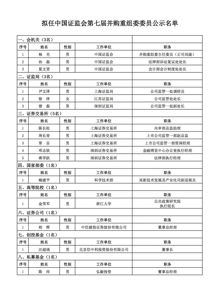 事实上,早在2018年10月25日,证监会便已公布了第七届并购重组委候选委员名单,候选的45位委员来自12个领域,分别为:会机关4名,证监局6名,沪深交易所10名,国家部委2名,高等院校2名,证券公司3名,创投基金3名,私募基金3名,公募基金3名,律师事务所3名,会计师事务所3名,资产评估机构3名。