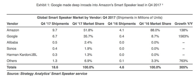 2017下半年开始,随着阿里、百度、京东、小米等中国玩家大举进军,整个市场从谷歌、亚马逊双强并峙逐渐变成多点开花局面,从2017年四季度到次年一季度是一个明显的转折点。
