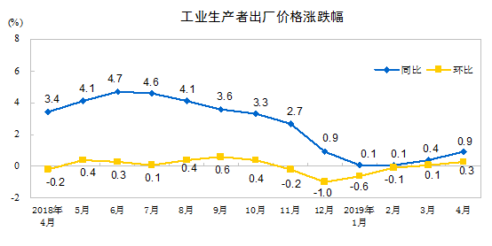 2019年4月份,全国工业生产者出厂价格同比上涨0.9%,环比上涨0.3%;工业生产者购进价格同比上涨0.4%,环比下降0.1%。1—4月平均,工业生产者出厂价格比去年同期上涨0.3%,工业生产者购进价格上涨0.2%。