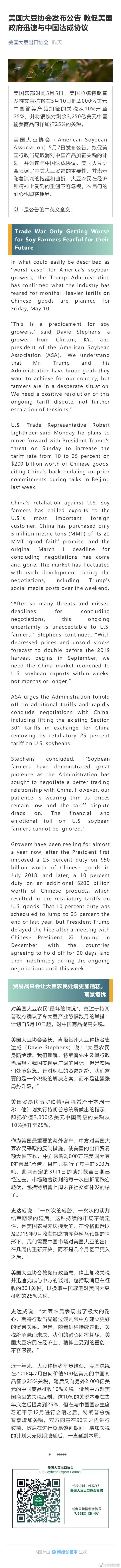 美国大豆协会(American Soybean Association)5月7日发布公告,敦促美国行政当局取消对中国产品加征关税的计划,并迅速与中国达成协议。美国大豆协会强调了中美大豆贸易的重要性,并表示随着谈判的拖延和曲折,大豆农民在经济和精神上受到的重创不容忽视,农民们的耐心也即将耗尽。