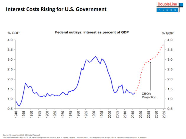 债务增多,利率上升,利息支出在GDP中的占比将显著扩大。
