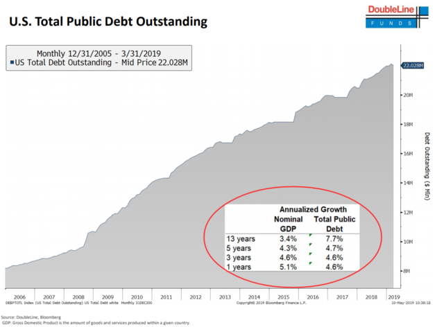 今年一季度,美国GDP季环比增长3.2%,大幅高于市场预期。不过新债王泼了一盆冷水,认为目前美国的GDP很大程度上由天量信贷驱动,GDP的增长几乎完全依赖国债、公司债和抵押债券。“经济的增长,仅仅是债务的增长而已。”