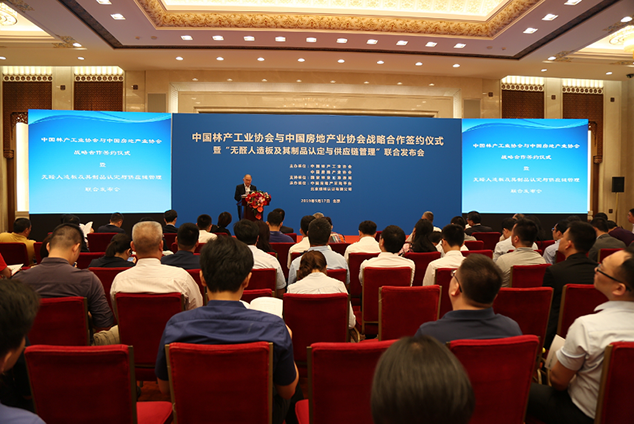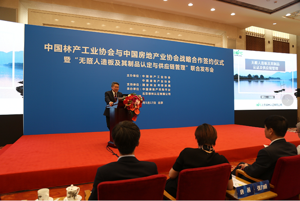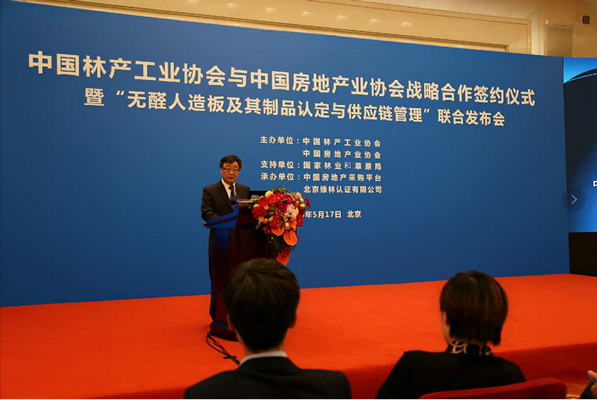 2019年5月17日“中国林产工业协会与中国房地产业协会战略合作签约仪式”暨“无醛人造板及其制品认定与供应链管理联合发布会” 在北京·人民大会堂召开。会议由中国林产工业协会秘书长石峰主持,中国房地产业协会会长冯俊出席本次发布会并致辞,来自中国林产工业协会及中国房地产业协会的企业家代表近200人受邀出席了本次盛会。