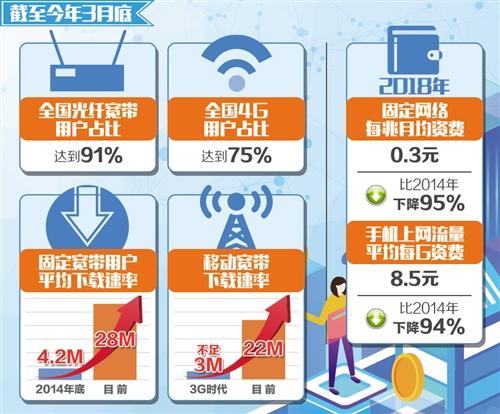 网速大幅提升,资费水平也在持续降低。工业和信息化部新闻发言人、信息通信发展司司长闻库表示,2018年,固定网络每兆月均资费为0.3元,比2014年下降95%,手机上网流量平均每G为8.5元,比2014年下降94%。