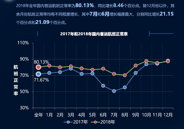 “国内客运航空公司航班正常率力争保持80%,全国主要机场放行正常率和始发航班正常率力争达到85%。”持续完善航班正常工作,是2019年全国民航工作会议提出的工作重点之一。