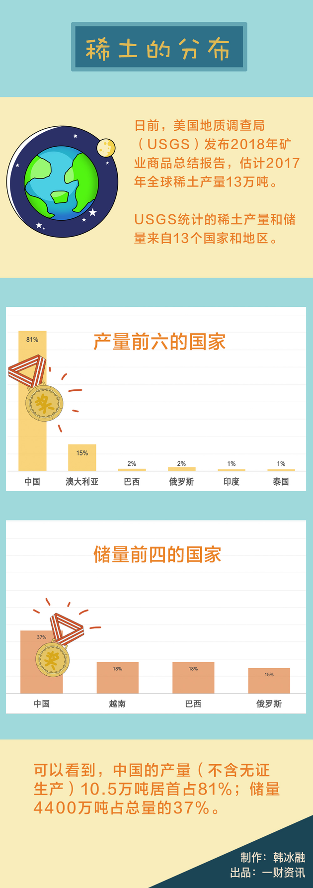 美国地质调查局(USGS)发布2018年矿业商品总结报告显示,估计2017年全球稀土(REO)产量13万吨,仅比2016年增加1000吨。中国、越南、巴西、俄罗斯稀土储量居前并占总量1.2亿吨的89%。USGS统计的稀土产量和储量来自13个国家和地区,中国的产量(不含无证生产)10.5万吨居首占81%;储量4400万吨占总量的37%。