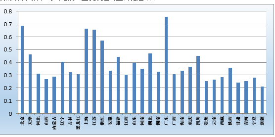 和前几年的指数比较,前几名的排序变化程度不大,广东、 北京、上海、江苏和浙江一直位居前5名,只是北京和上海在二三名的位置上波动,浙江和江苏在四五名的位置上波动。