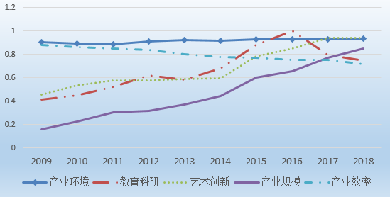 (3)从中国电影产业分项指数看,电影产业效率尤其值得关注,亟待提高;电影产业的国际影响力,仍存在一定的差距。