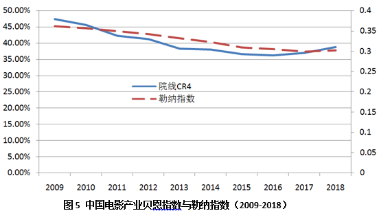 图5 中国电影产业贝恩指数与勒纳指数(2009-2018)