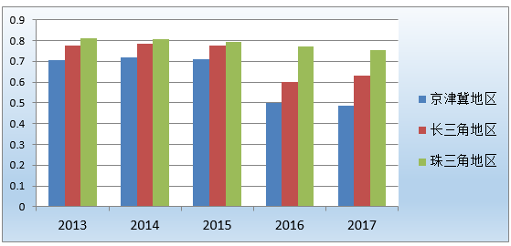 从三个重点经济区域的电影产业指数分析,珠三角地区一直位居第一,长三角位居第二,京津冀位居第三。