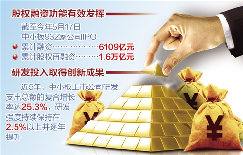 股权融资功能有效发挥。截至今年5月17日,中小板932家公司IPO累计融资6109亿元,累计股权再融资1.6万亿元。其中,340家公司上市后融资超过2次,58家公司上市后融资超过4次,市场直接融资功能不断强化。