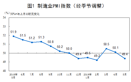 2019年5月份,中国制造业采购经理指数(PMI)为49.4%,比上月回落0.7个百分点。