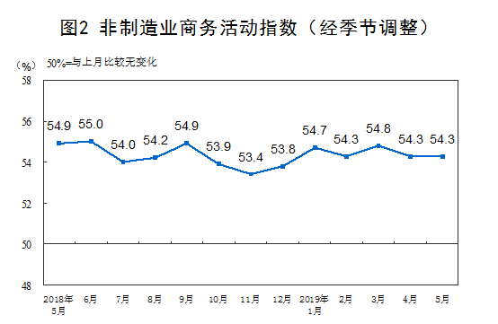 2019年5月份,中国非制造业商务活动指数为54.3%,与上月持平,表明非制造业总体延续平稳较快的发展势头。
